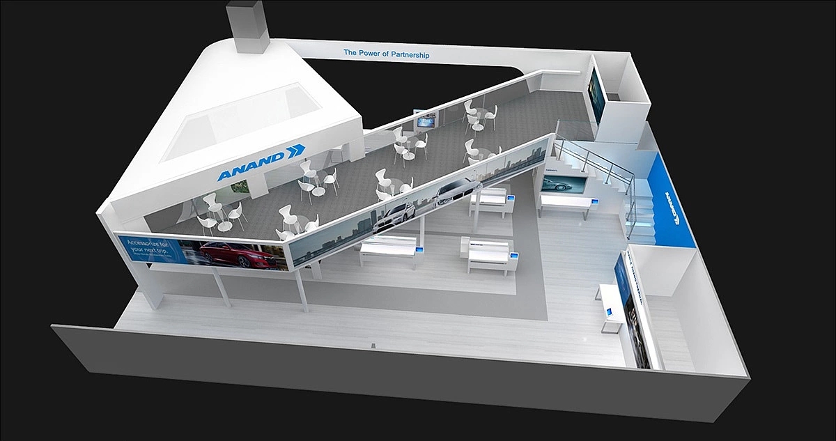 該展臺分為上下兩大部分,其中一樓設置了會客區、互動體驗區、產品展示區、儲物間等各功能區。前臺接待區設立了一個拼接巨屏用于展示參展商的文化價值等,用綠色的植被圖片作為墻面裝飾,展示了自然與科技的結合,體現參展企業環保的理念。一樓還設置了多個互動裝置,保證參展觀眾能更好的體驗該企業汽車產品的優越之處。二樓透明長廊的洽談區,斜跨整個展臺,能帶來較好的觀景體驗,對展臺空間一覽無遺。