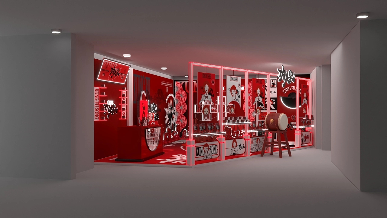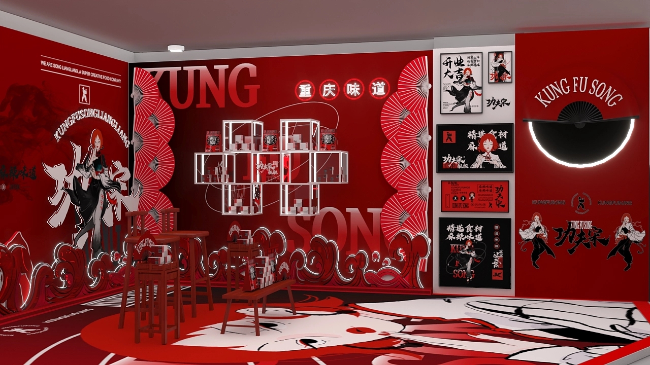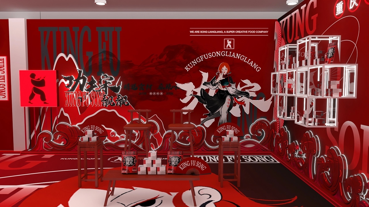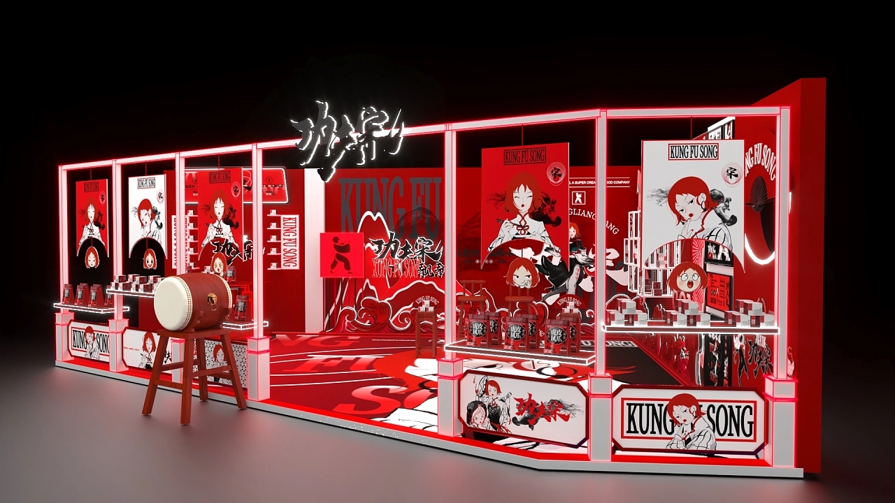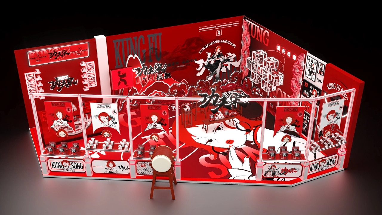 該展位根據搭建展位的位置進行整個面積的規劃,展臺設計融合了該企業特性用大紅色作為展位設計搭建的色彩,正面用五個鏤空版畫海報和窗臺進行展臺展品的宣傳展示,整個展臺設計搭建充滿國風的風格,讓來往的人流能更好的感受該企業的文化價值與產品特性,促進成交量的提升。