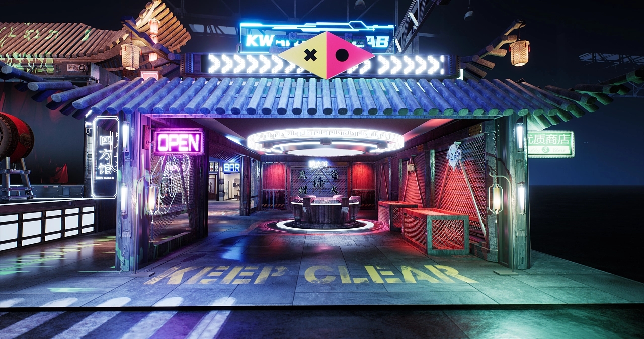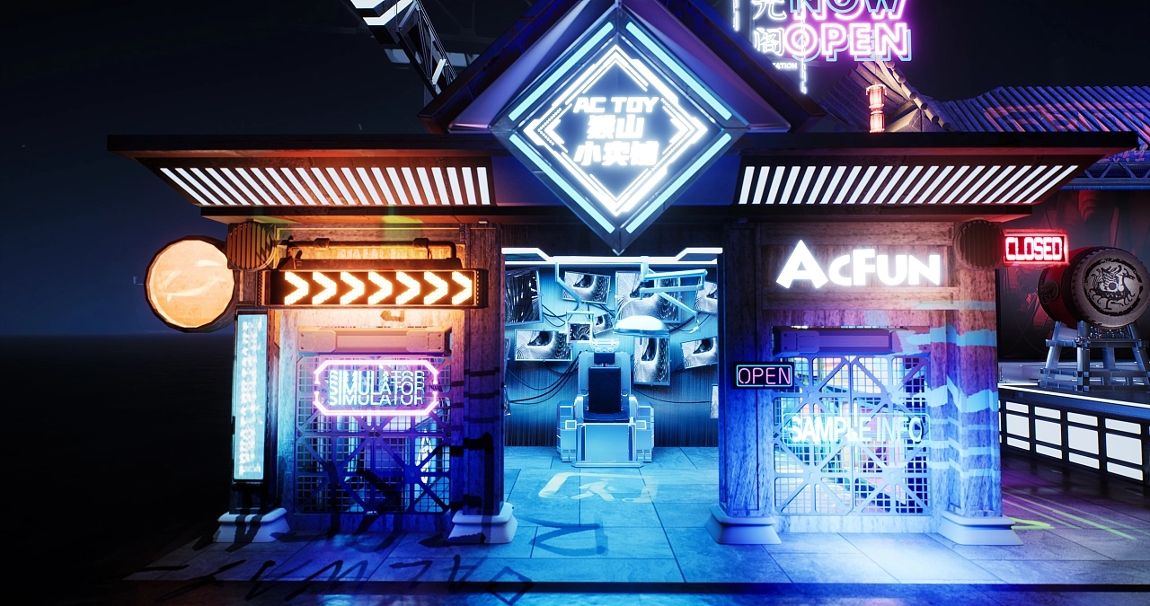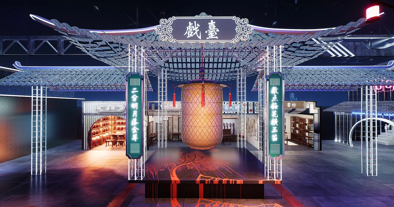 展臺設計搭建了一個國風賽博朋克式的展臺造型。不同顏色和造型的發光字交錯分布在展臺的每個角落,令參展觀眾仿若進入游戲世界當中,國風的建筑與現代感的燈光結合在一起,增加了時空的錯亂感和游戲的真實感,給人沉浸式的空間氛圍感受。