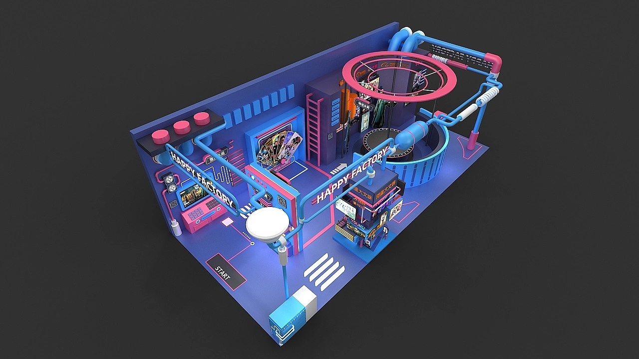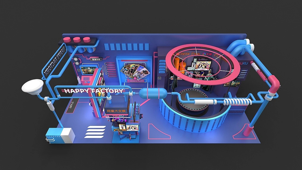 展臺設計搭建面積為72平方米,為了結合該企業游戲及影視等產品的特性,在展臺設計上選用了超現實科幻主義的展臺風格,在顏色上使用了藍色作為展位設計的主色彩,搭配粉色等亮眼色,起到撞色的效果,強化展臺設計的視覺效果,在展臺搭建元素上用水管連接整個展臺,給人一種粗狂原始的空間氛圍,營造出非現實的展臺空間感。