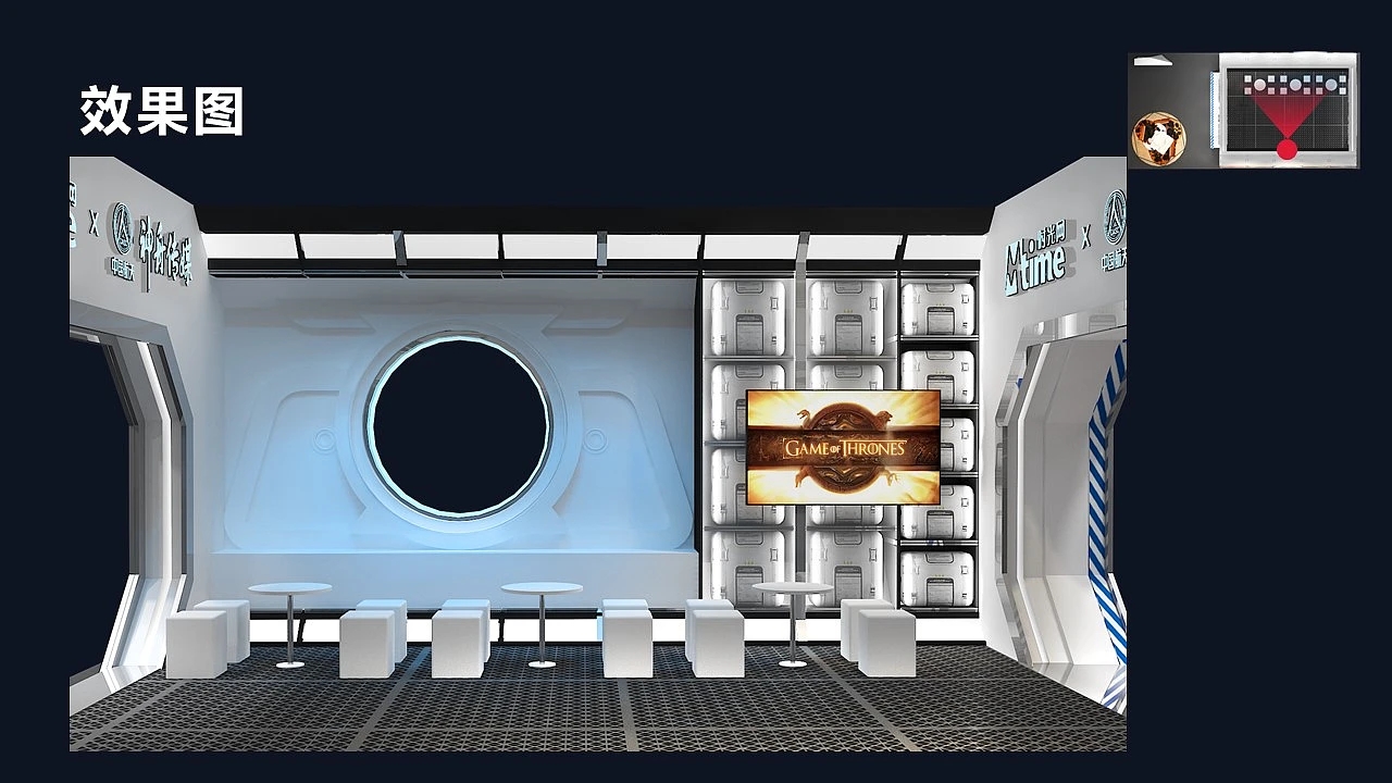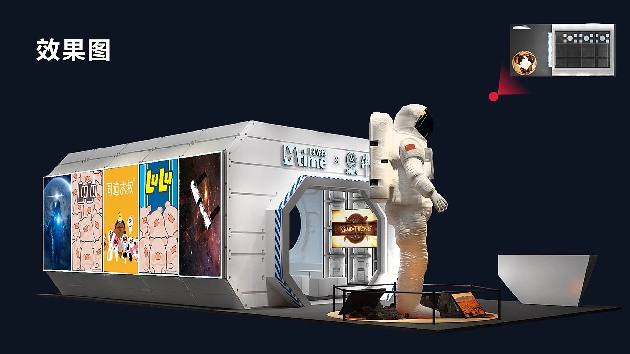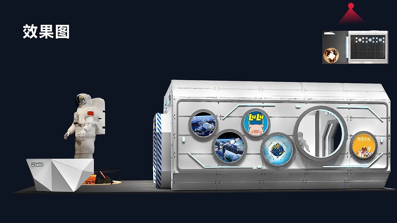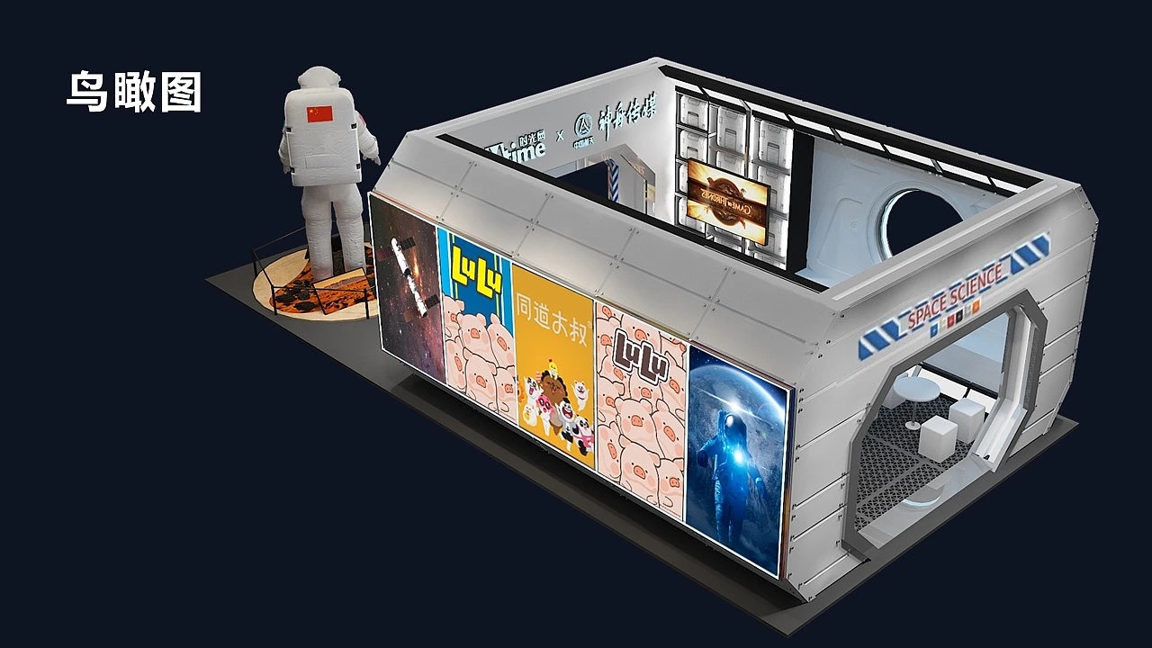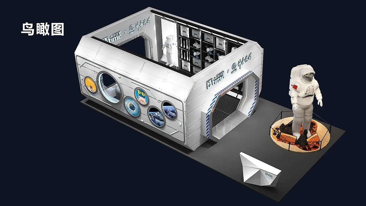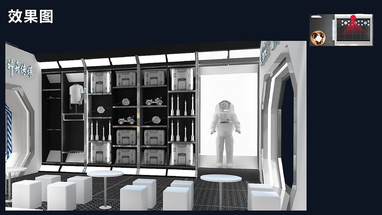 該展臺設計是航天主題的展臺,為結合展臺的主題,該展臺設計搭建了一個太空艙造型的展臺,展臺前方搭建了一個宇航員的模型。展臺外立面的電子屏可以進行企業產品與文化宣傳,展臺空間獨特的造型能吸引來往的會展觀眾的注意,整個展臺設計搭建充滿了科技感,讓會展觀眾仿佛置身在太空當中,帶來出色的空間體驗。